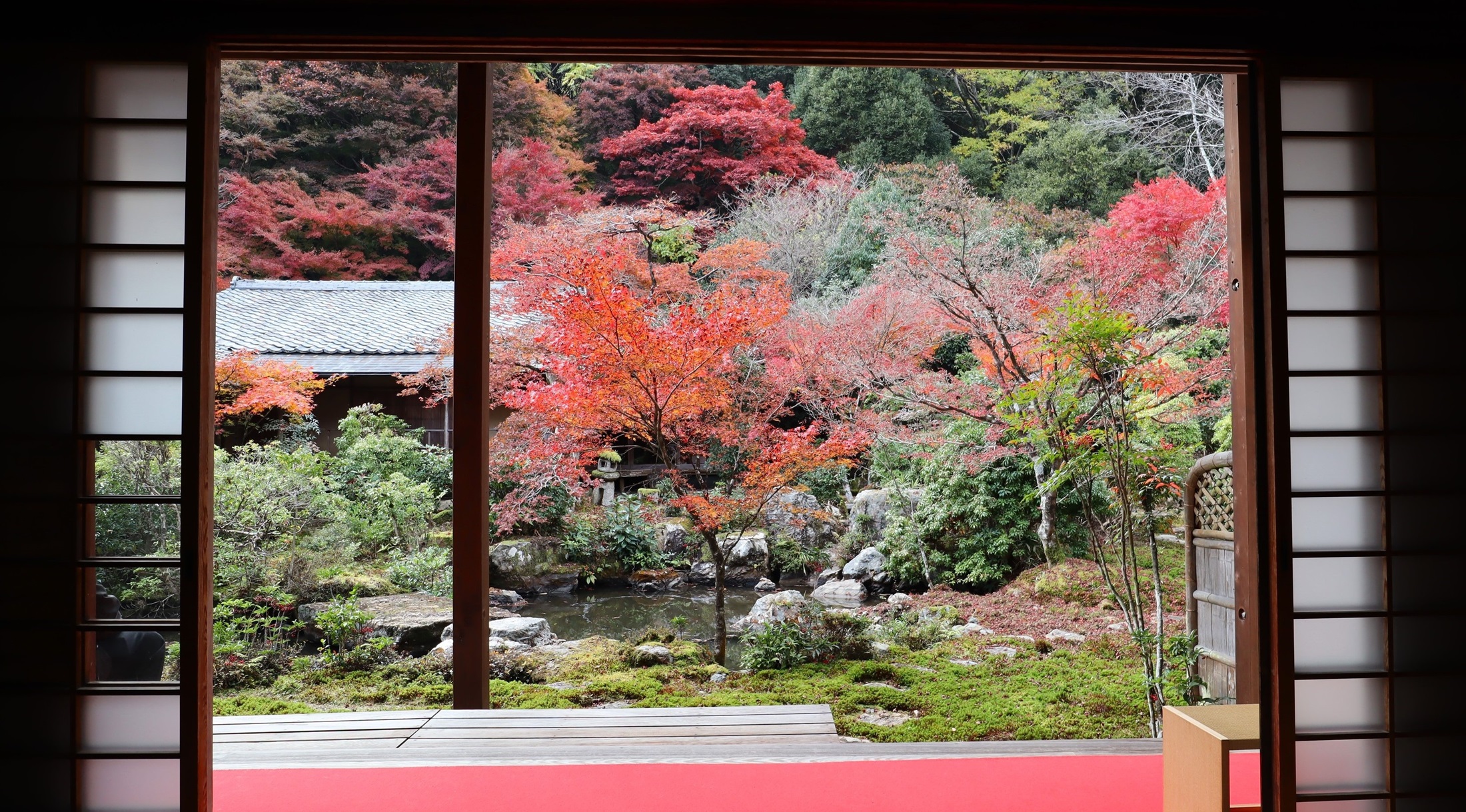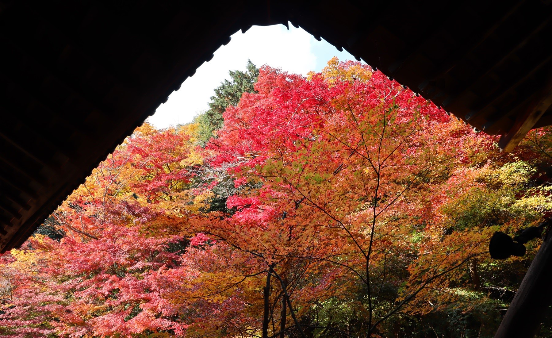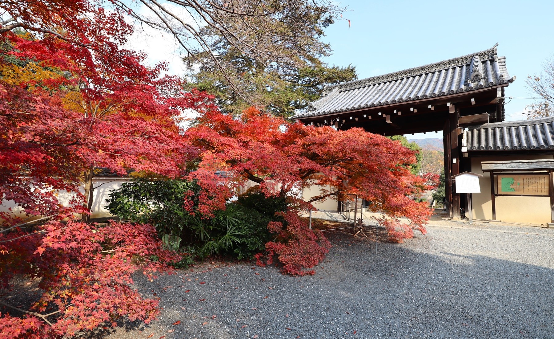 客殿の屋根越しに見える紅葉富士