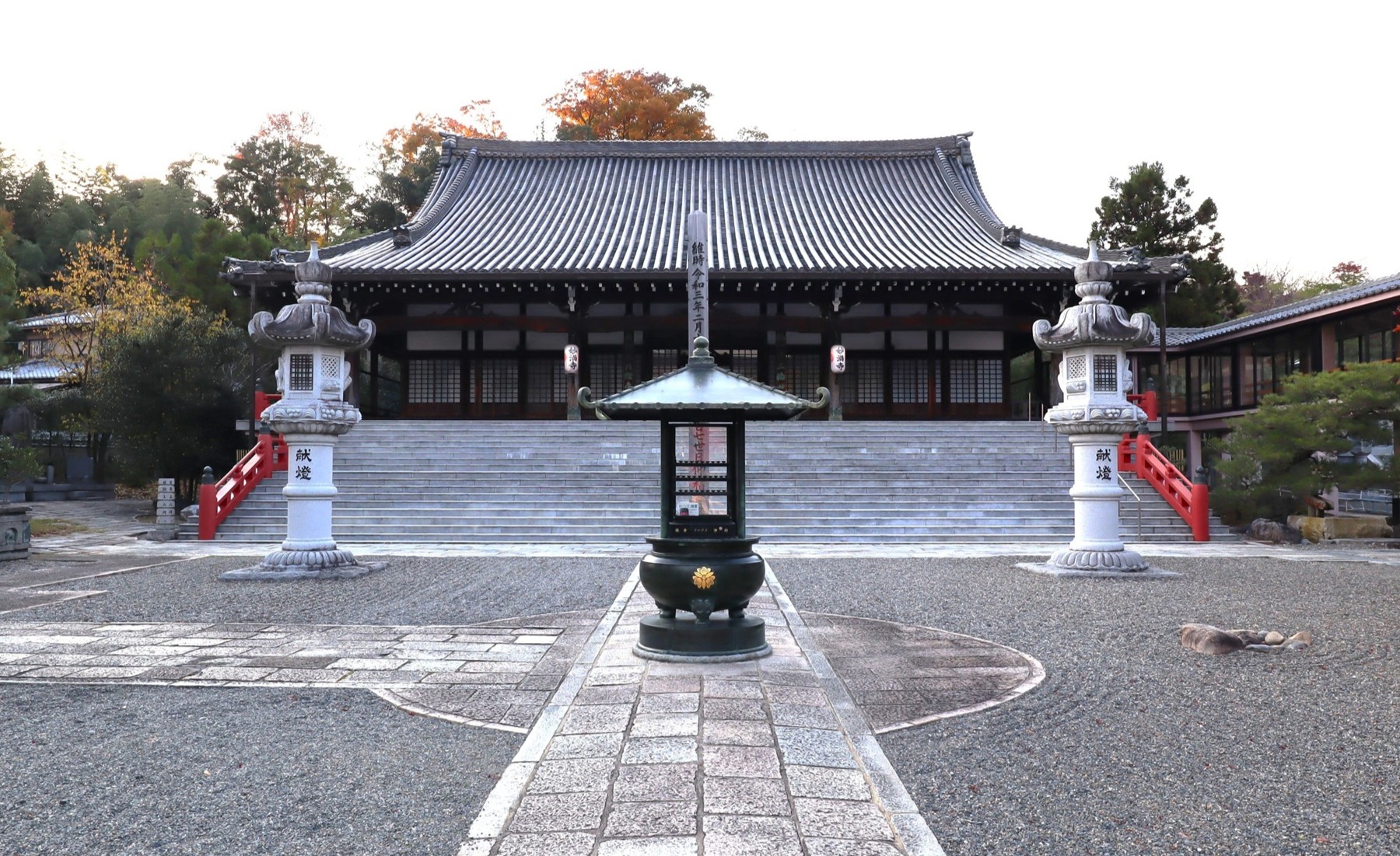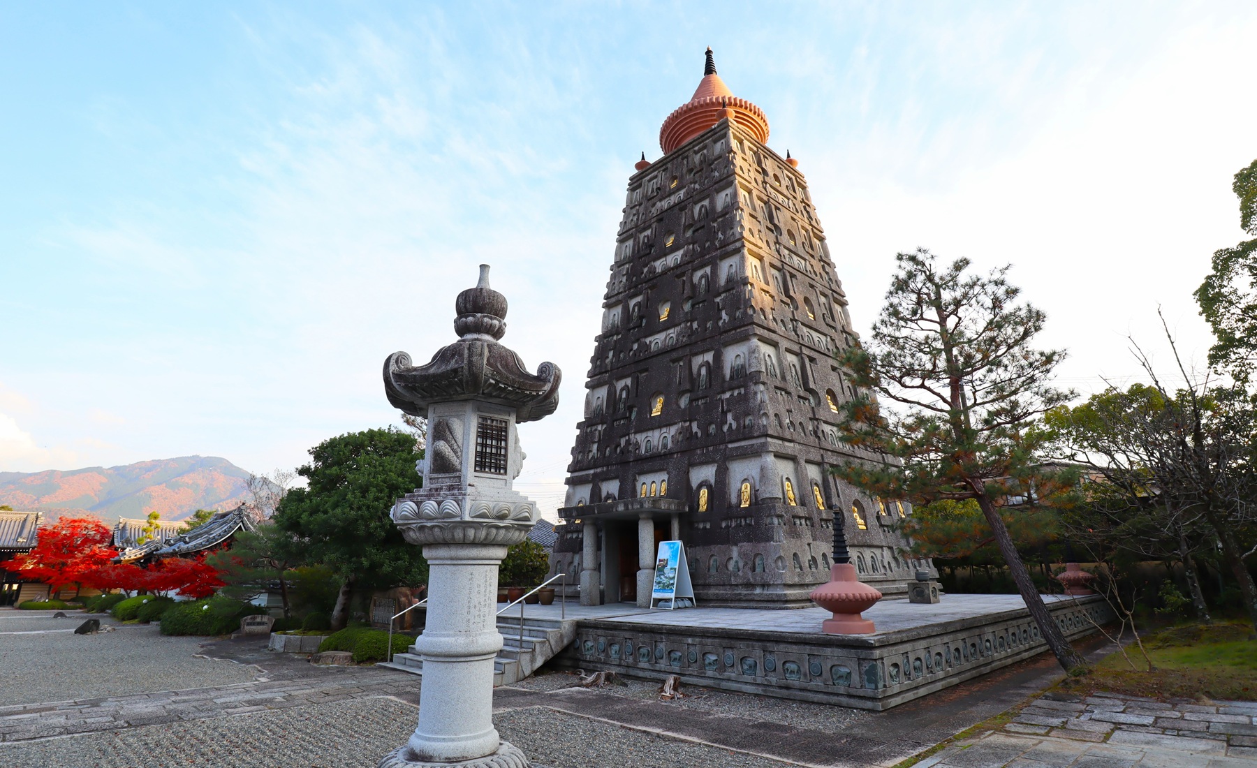 本堂より庫裡、山門、仏舎利大塔、そして比叡山