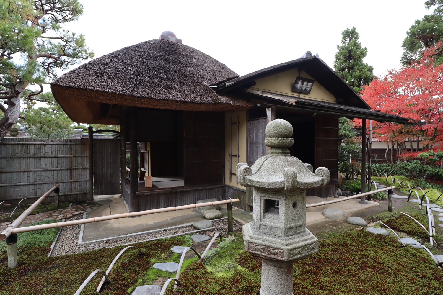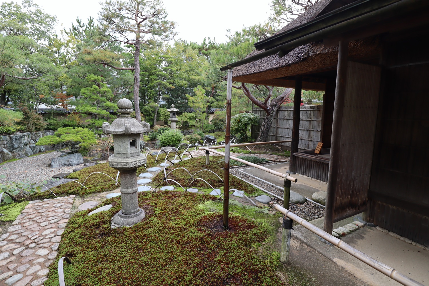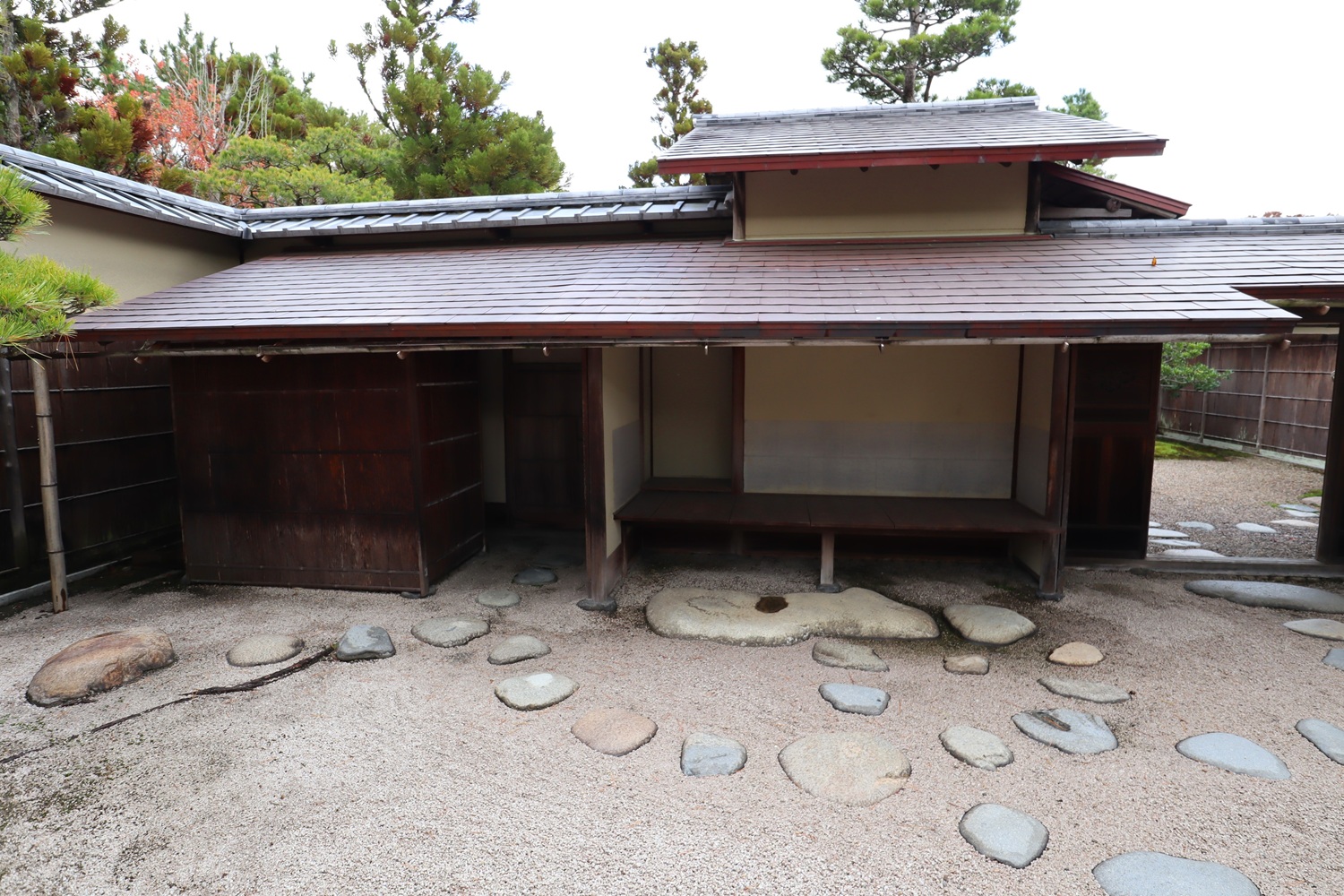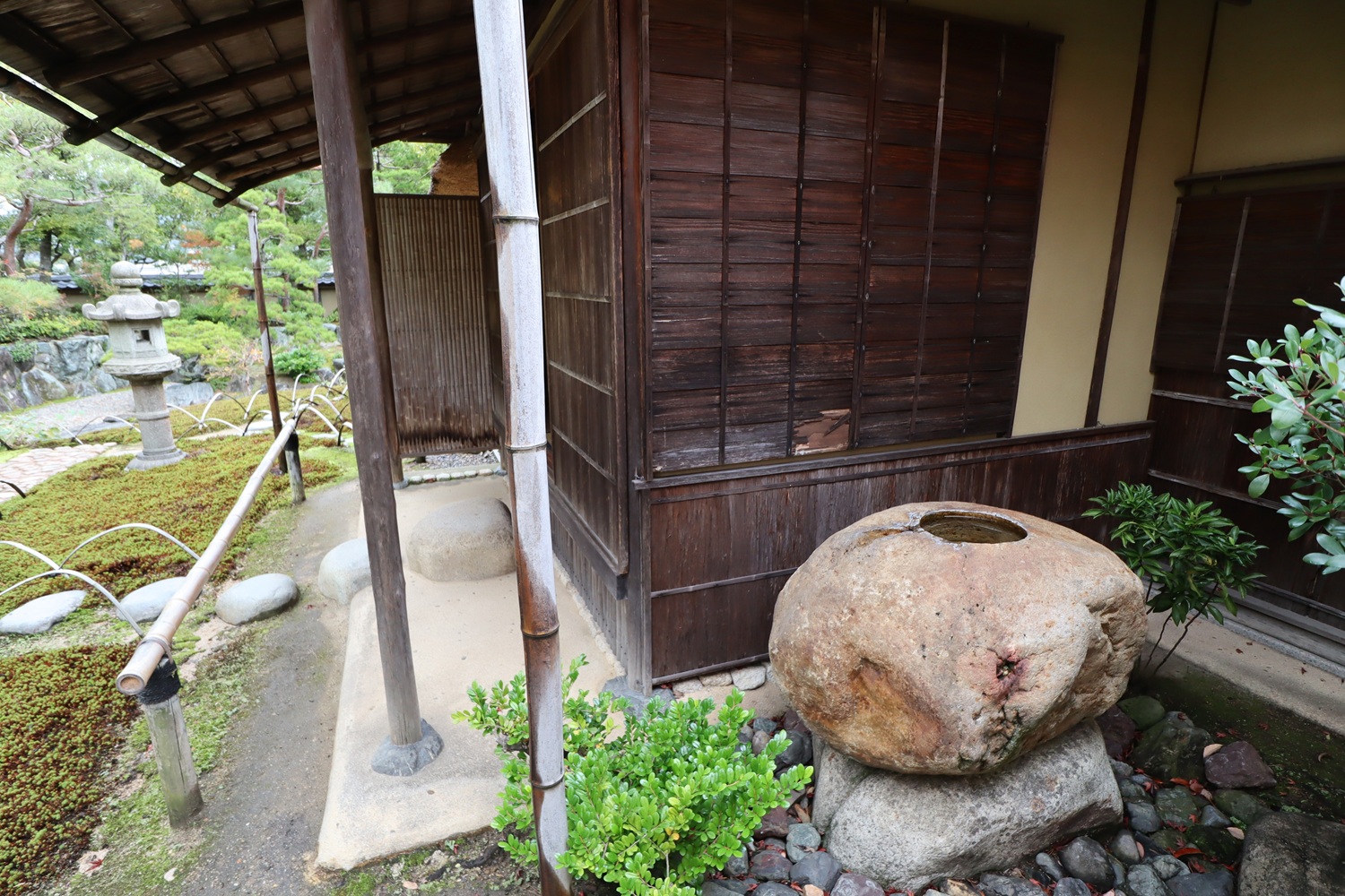 | メモ: | 出雲文化伝承館には旧江角邸とは別に「独楽庵」とその露地が復元されています。松江藩7代藩主松平不昧公が江戸大崎の下屋敷に作庭した「三関三露」と呼ばれる茶室と露地庭を中村昌生による監修でこの地に再現しました。三関は「利休席」「船越席」「泰叟席(たいそう)」の三席が組み合わさった茶室を言います。三露は露地庭が外露地、中露地、内露地の三つに分かれていることを示します。 |