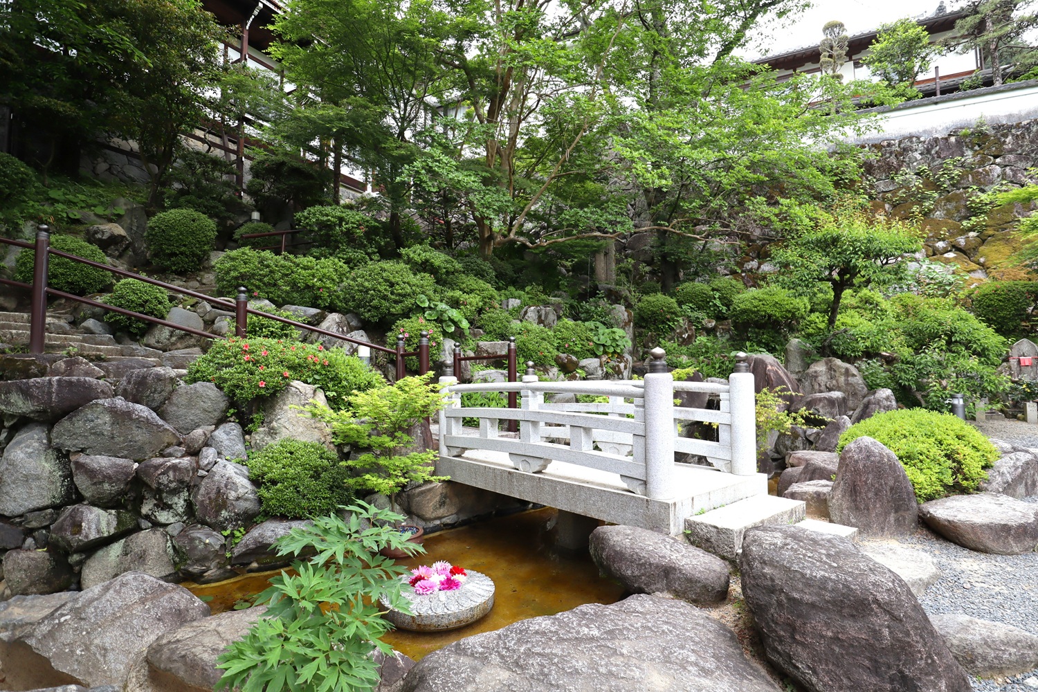 仁王門を入りダリアで埋め尽くされた手水舎の奥に庭園が広がります。もうひとつ、本堂への石段を昇った途中に小さな枯山水があります。本堂のわが国最大の塑像である如意輪観音は見ものです。