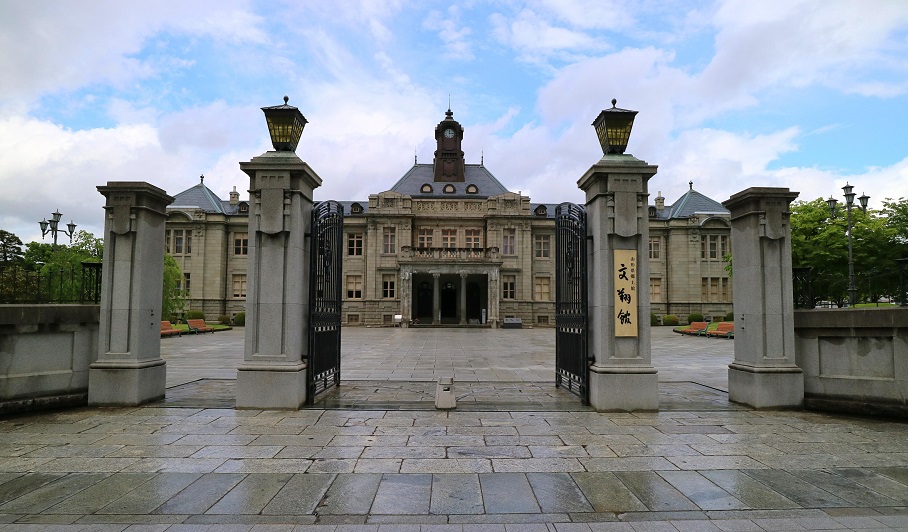 | ■文翔館正門 山形市役所前の通りから北側をみると文翔館が見える。 正門より入館、入館料無料 | |